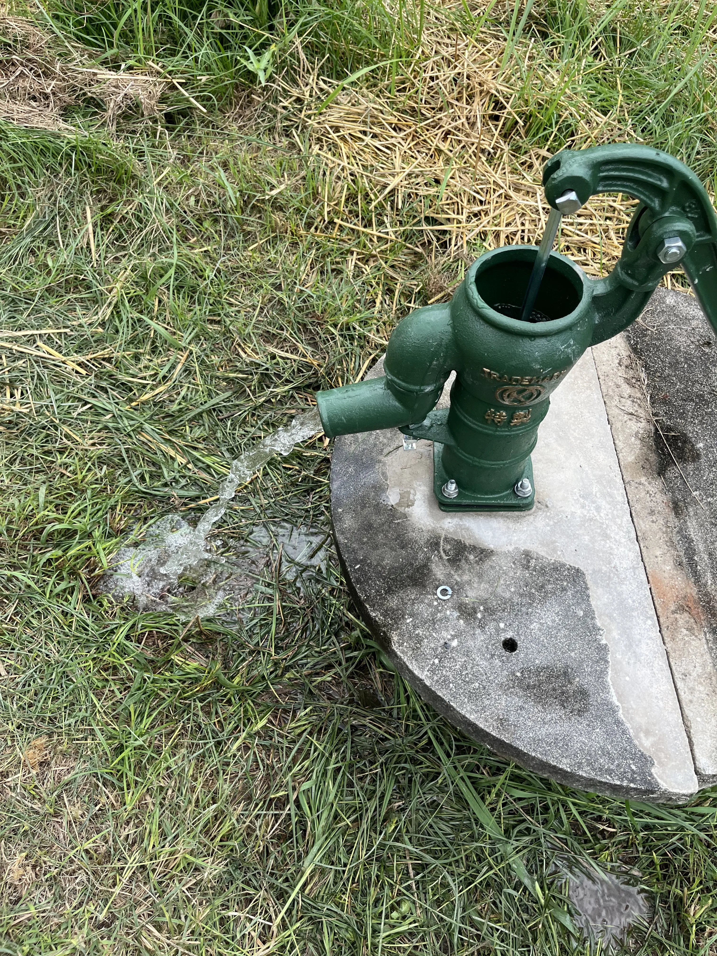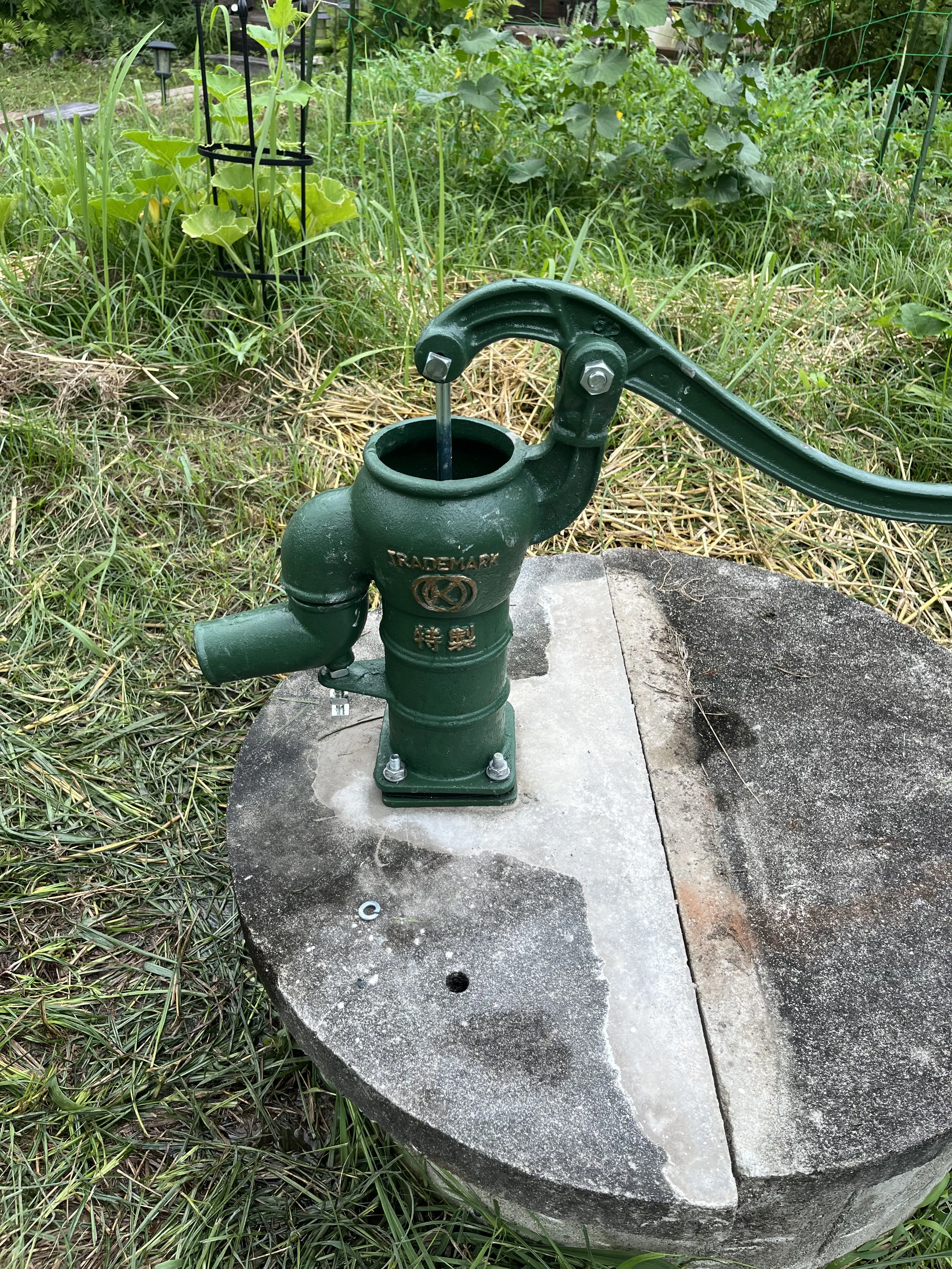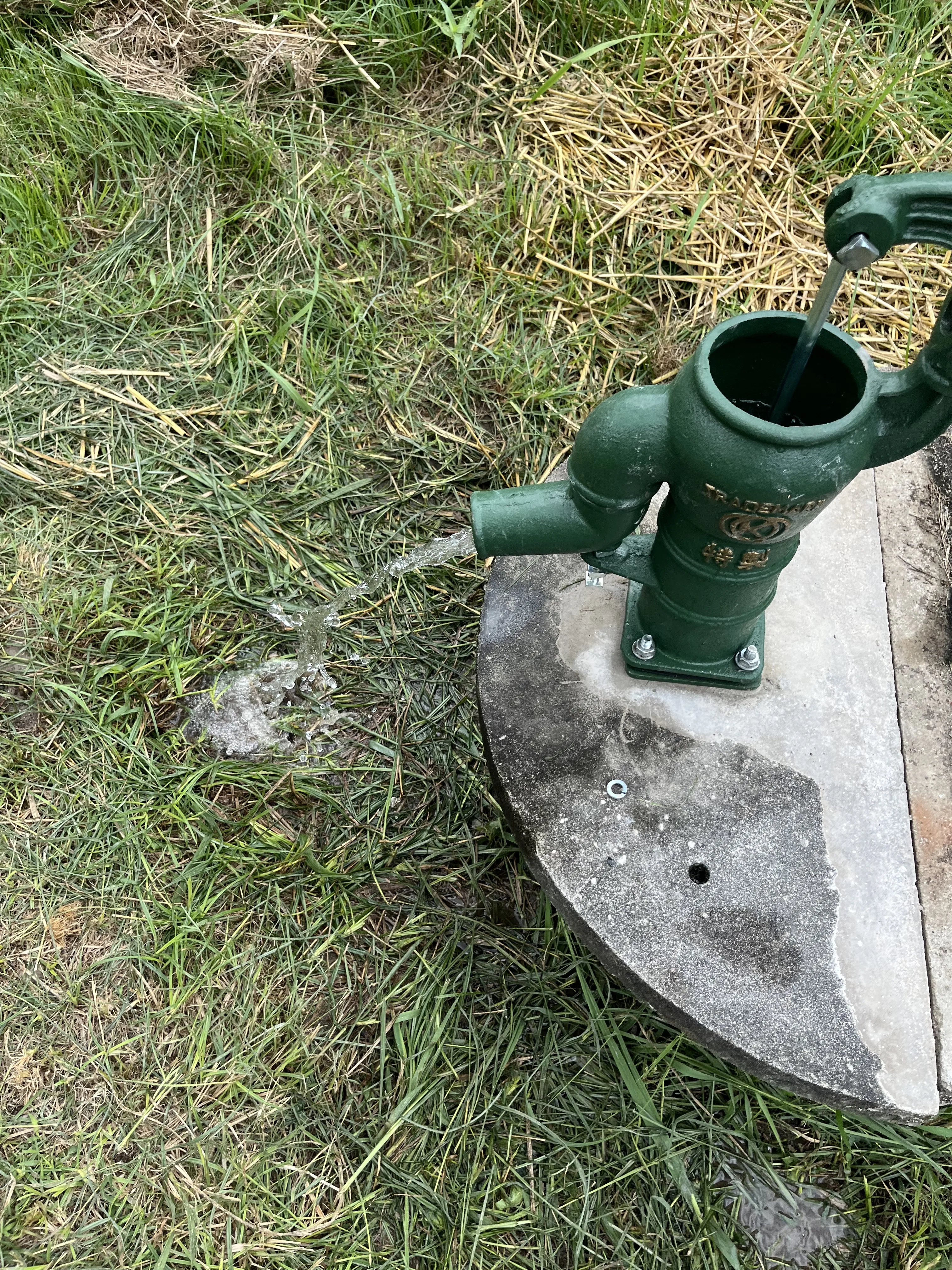 写真にある通り、コンクリートの井戸蓋にしっかりと固定し、スムーズに水が出るよう調整を行いました。レバーを上下させるたびに、心地よい音と共に透き通った水が溢れ出します。